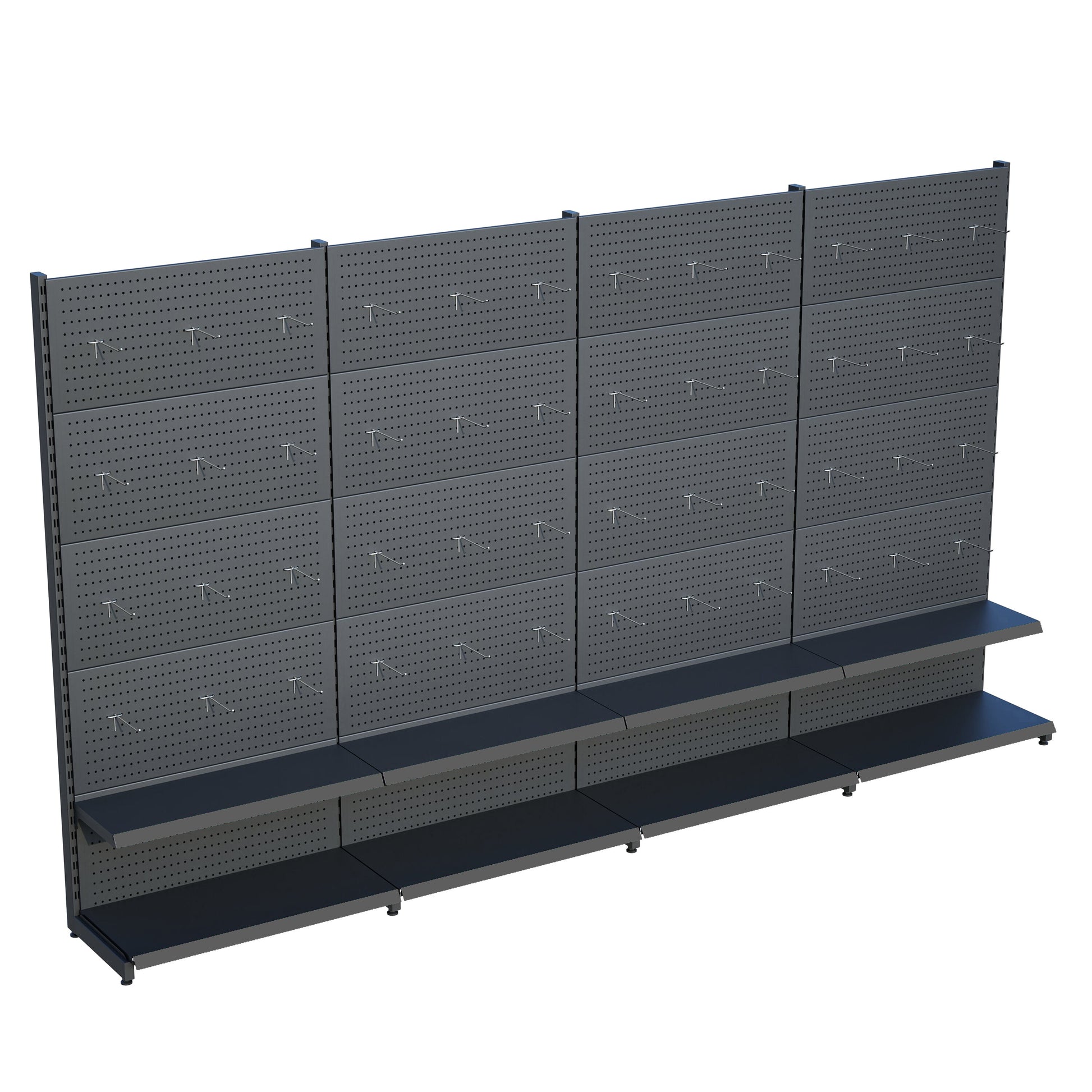 Antrasit Renk 2 Katlı Kancalı Hırdavat Raf Sistemi | Market Rafı | PetShop Rafı | Kırtasiye Rafı Yükseklik H220 CM Yan Yana 4'li Birleşik, dayanıklı yapısı, yüksek taşıma kapasitesi ve şık tasarımı ile market, bakkal, depo ve mağaza düzenleme ihtiyaçlarınız için ideal çözümdür.