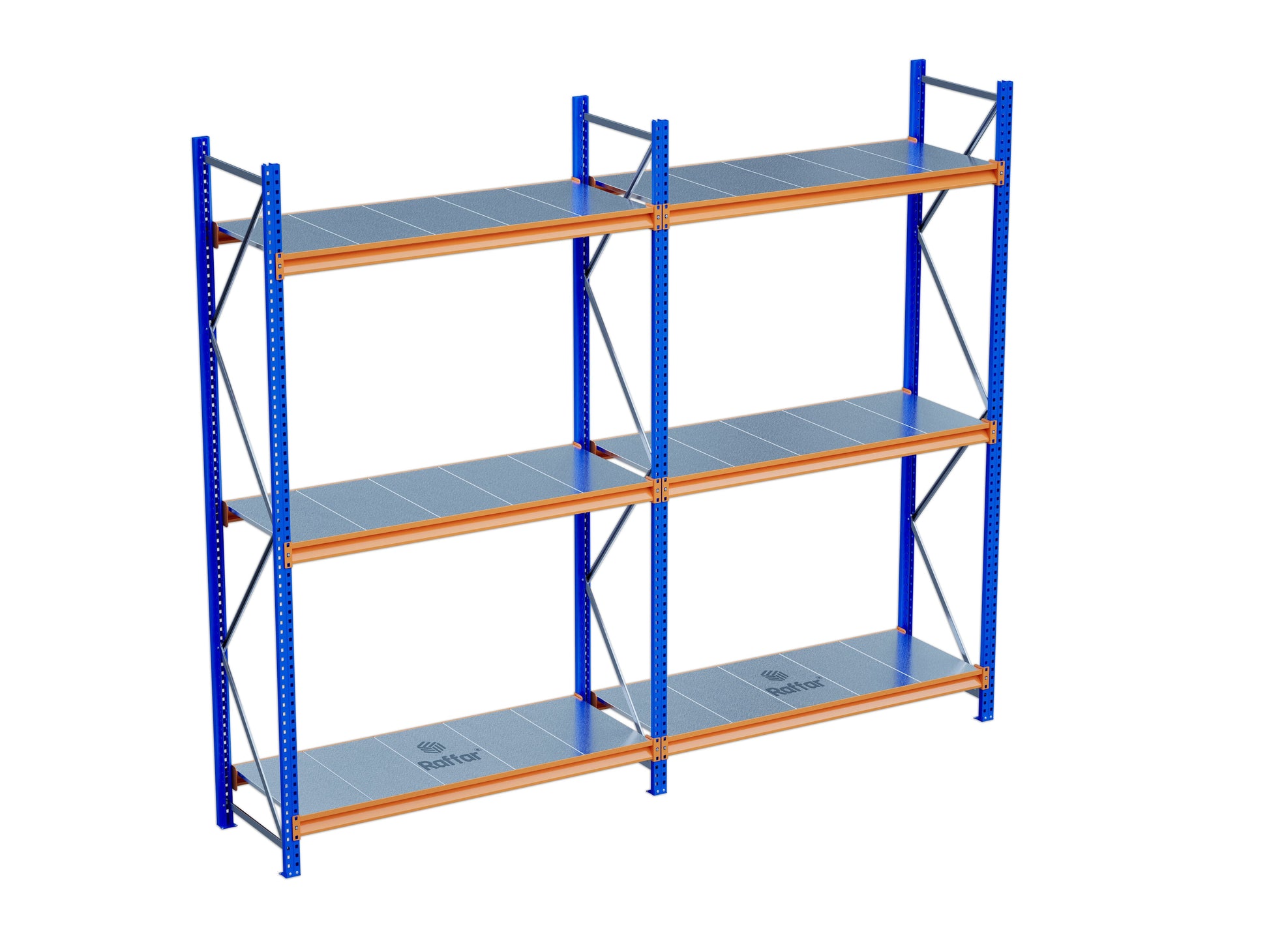 Endüstriyel depolama alanlarında maksimum dayanıklılık ve düzen için tasarlanan bu raf sistemi, mavi renkli ayaklar ve turuncu traverslerle güçlendirilmiştir. Raf tablaları galvaniz kaplamalı çelikten üretilmiştir ve uzun ömürlü kullanım sağlar.