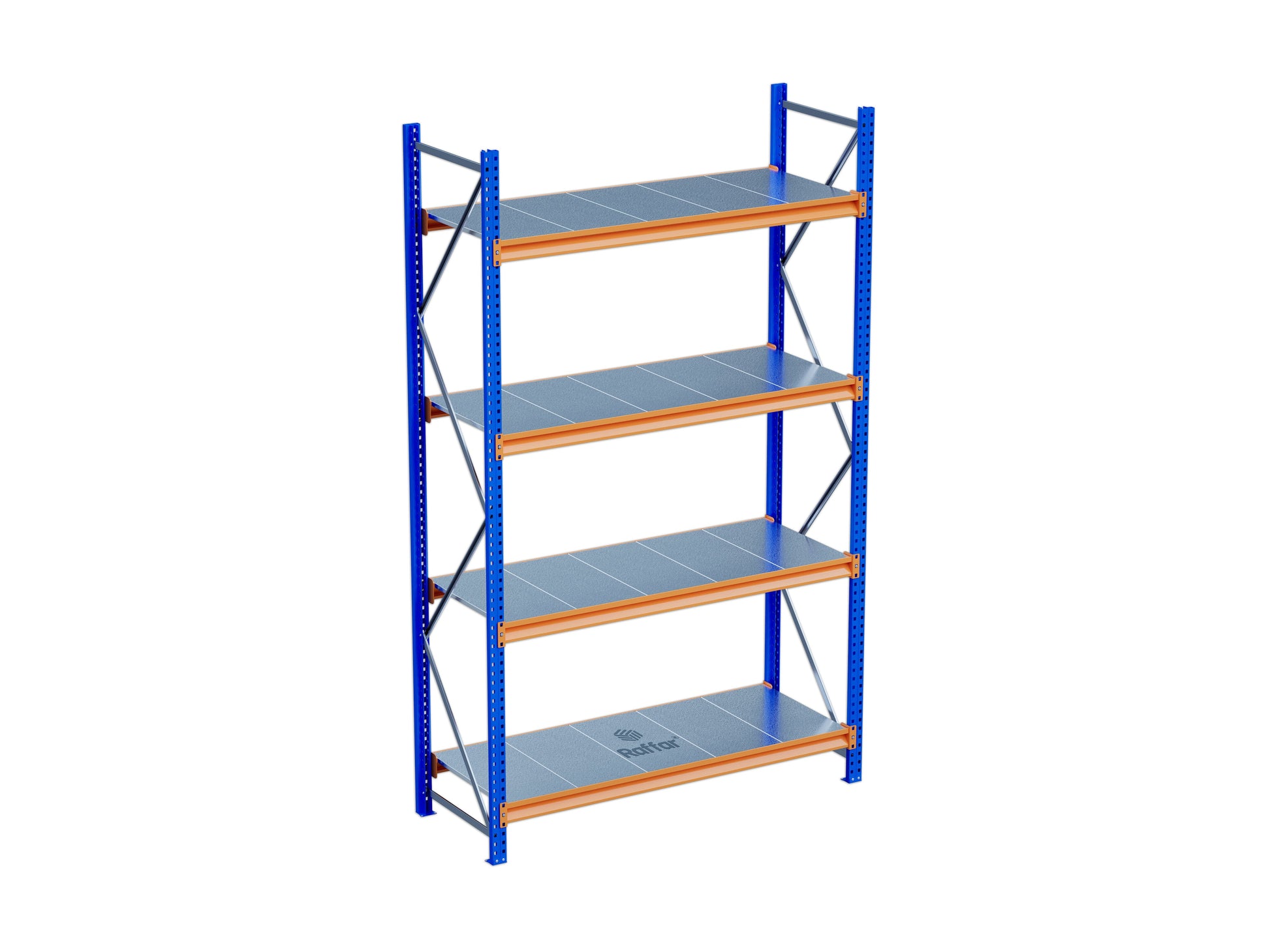 Endüstriyel depolama alanlarında maksimum dayanıklılık ve düzen için tasarlanan bu raf sistemi, mavi renkli ayaklar ve turuncu traverslerle güçlendirilmiştir. Raf tablaları galvaniz kaplamalı çelikten üretilmiştir ve uzun ömürlü kullanım sağlar.