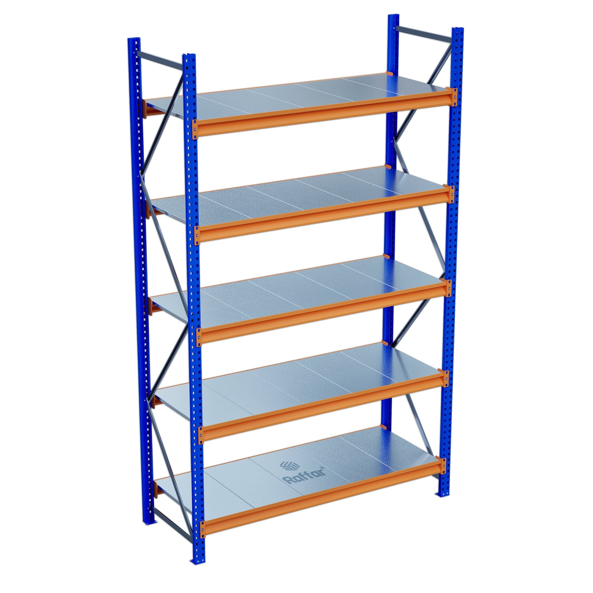 Endüstriyel depolama alanlarında maksimum dayanıklılık ve düzen için tasarlanan bu raf sistemi, mavi renkli ayaklar ve turuncu traverslerle güçlendirilmiştir. Raf tablaları galvaniz kaplamalı çelikten üretilmiştir ve uzun ömürlü kullanım sağlar.